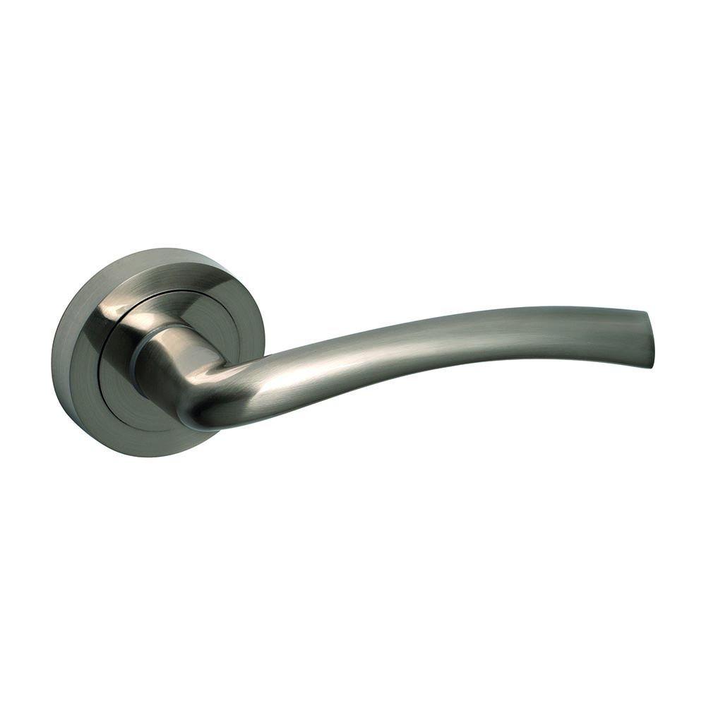JUEGO DE MANIVELAS MODELO LYRA C/ROSETA 50MM EN NIQUEL SATINADA.