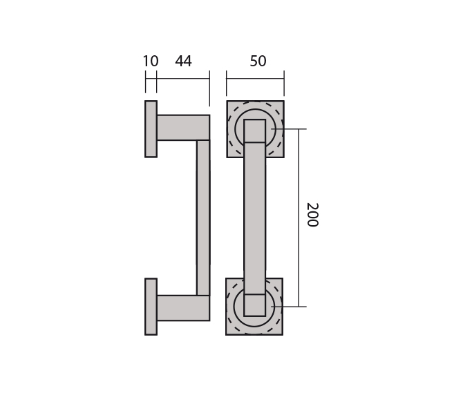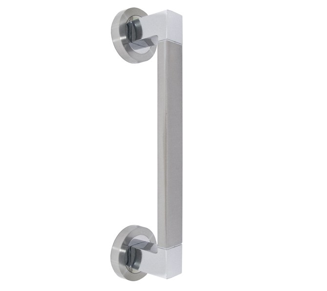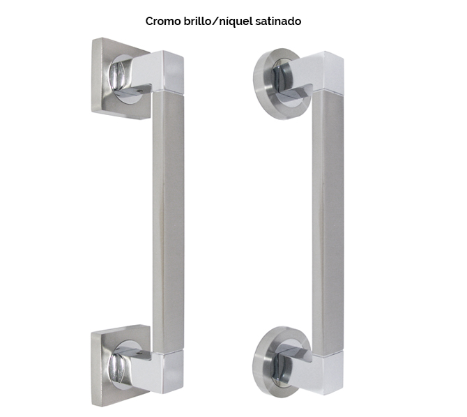 Manillón o tirador zamak de 200 milímetros, con roseta redonda y cuadrada de 50 milímetros.